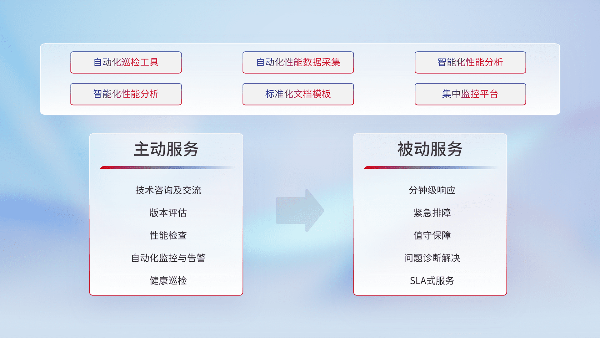 智能化工具和标准化文档,,,,保障服务质量,,提供主动服务(包含技术咨询、、版本评估、、性能检查、、、自动化监控与告警、、、、健康巡检)和被动服务包含(分钟级响应、、紧急排障、、、值守保障、、、问题诊断解决、、SLA服务)。。